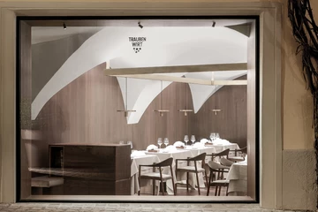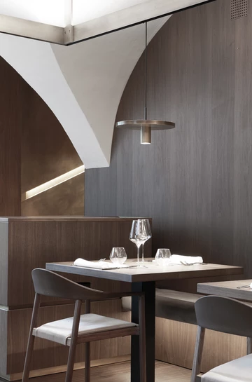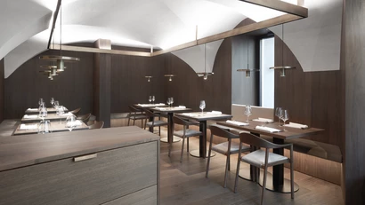 Bei diesem Projekt handelt es sich um die Erweiterung eines bestehenden Restaurants im historischen Stadtzentrum von Brixen. Inspiration war die Architektur von Luigi Caccia Dominioni und Carlo Scarpa. Verwendet wurden nur hochwertige Materialien wie rohes Messing und geöltes, massives Nussholz. Die Tische und Lampen sind frei verstellbar, sodass sie sich verschieden kombinieren lassen.