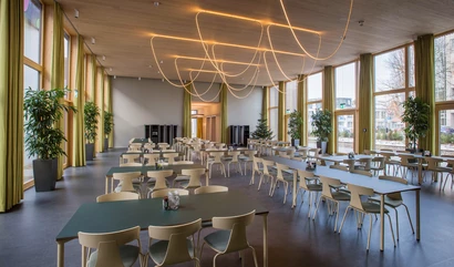 Restaurant designed by architecture office NEOOS, whose founders Udo Kloos and Markus Honka were tasked with creating a multipurpose hall that can also be used for hosting events.