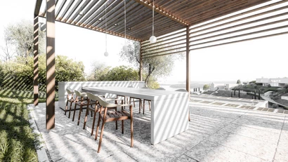 The project is an outdoor addition to a villa at Eden Reserve on Lake Garda, designed by Pritzker Prize winner David Chipperfield. It features a pool area with a pergola, shower, and outdoor kitchen that integrate seamlessly with the overall architecture. The result is an open space for relaxing, dining, and sunbathing, offering a breathtaking view of the lake.