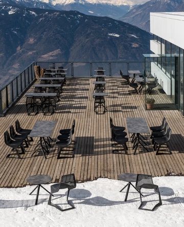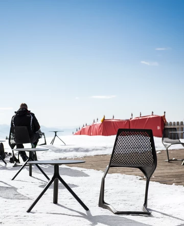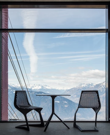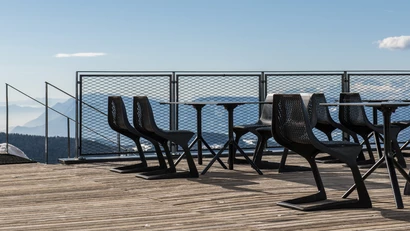 Meran 2000 Bergbahnen AG, situated on the panoramic terrace of the Meran 2000 ski and hiking plateau above Merano, presents a refined outdoor dining area at the Panorama-Bistro, designed by Roland Baldi. The terrace blends clean geometry with expansive alpine views, creating a serene setting that balances architectural precision and natural immersion.